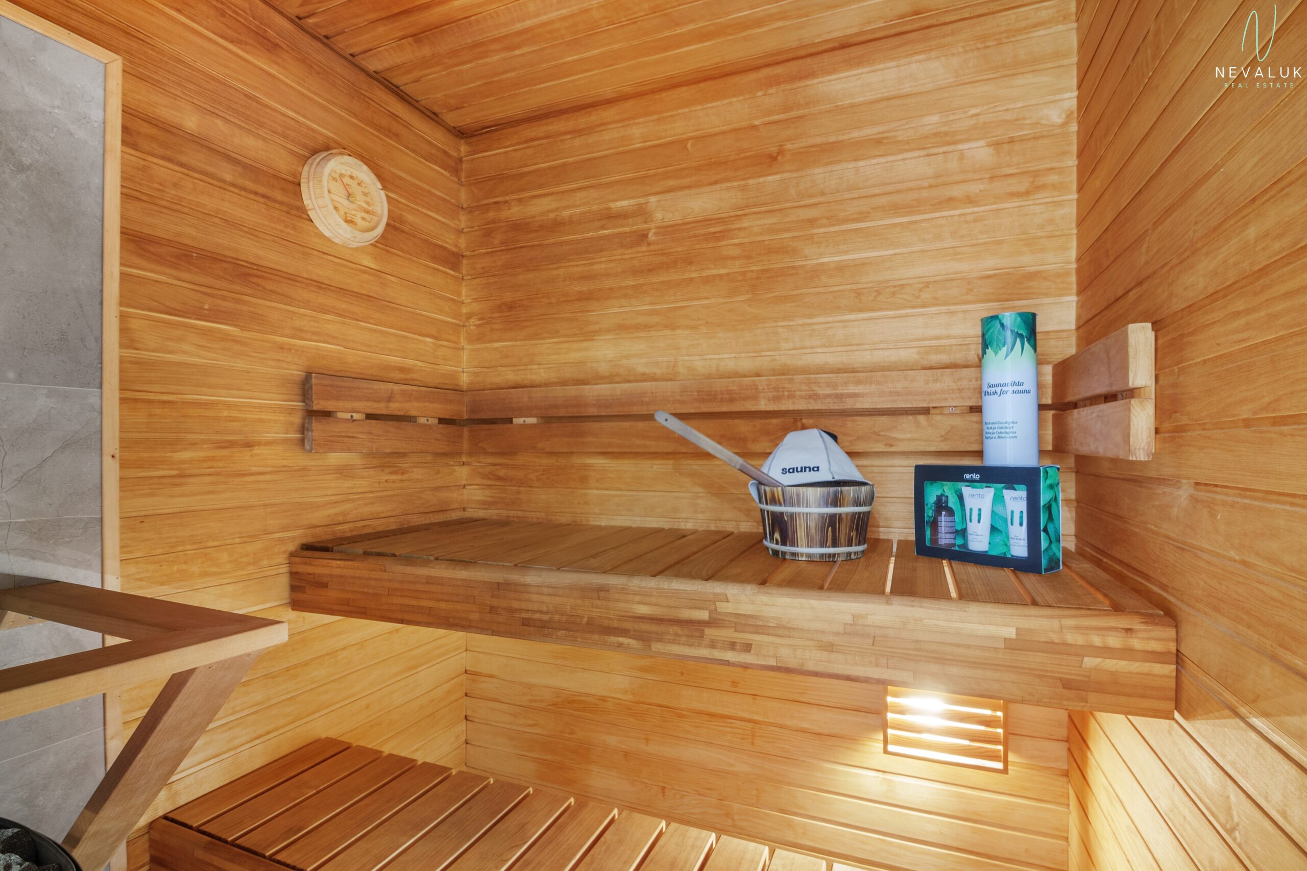 Next to the living room is a laundry room with a sauna – the room is finished with stylish tiles and has a bathtub, sink, toilet and sauna with an electric heater, where you can really relax after a long day.