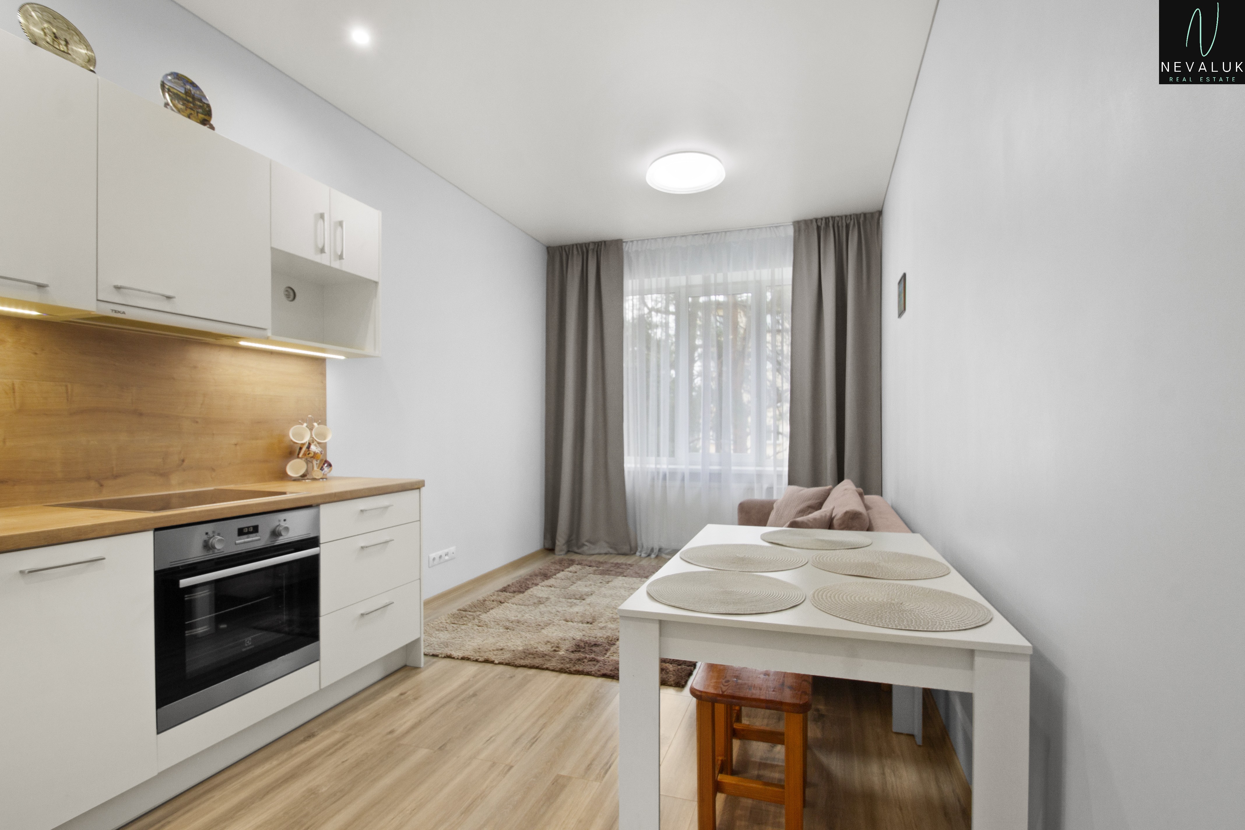 The living space with an open kitchen is the heart, with new kitchen furniture and high-quality appliances: an electric stove and oven, a hood, a refrigerator and a dishwasher. The sanitary room has a bathtub, shower, boiler and washing machine – all thoughtfully and stylishly designed.