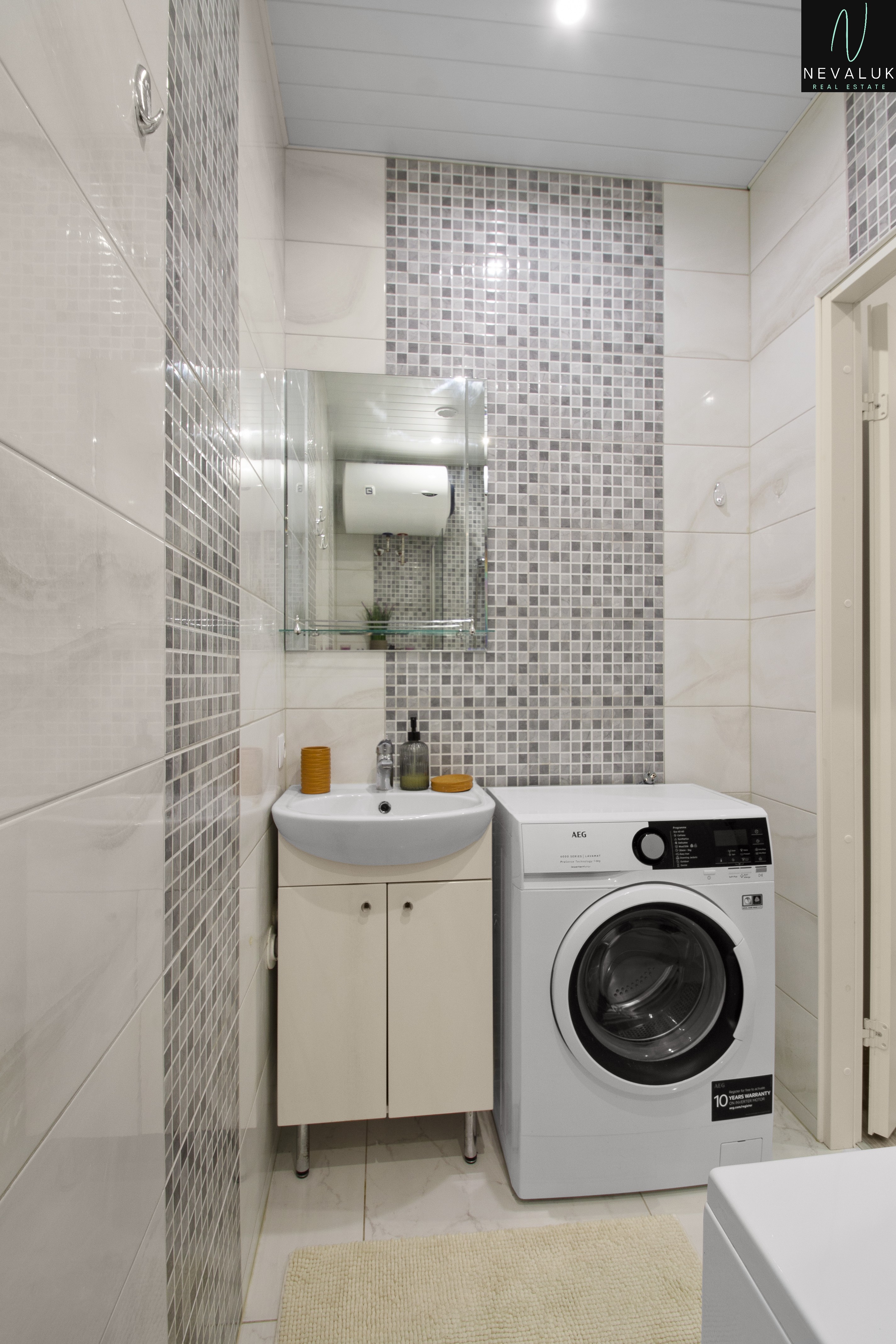 Bathroom: bathtub, boiler, shower, new plumbing, washing machine