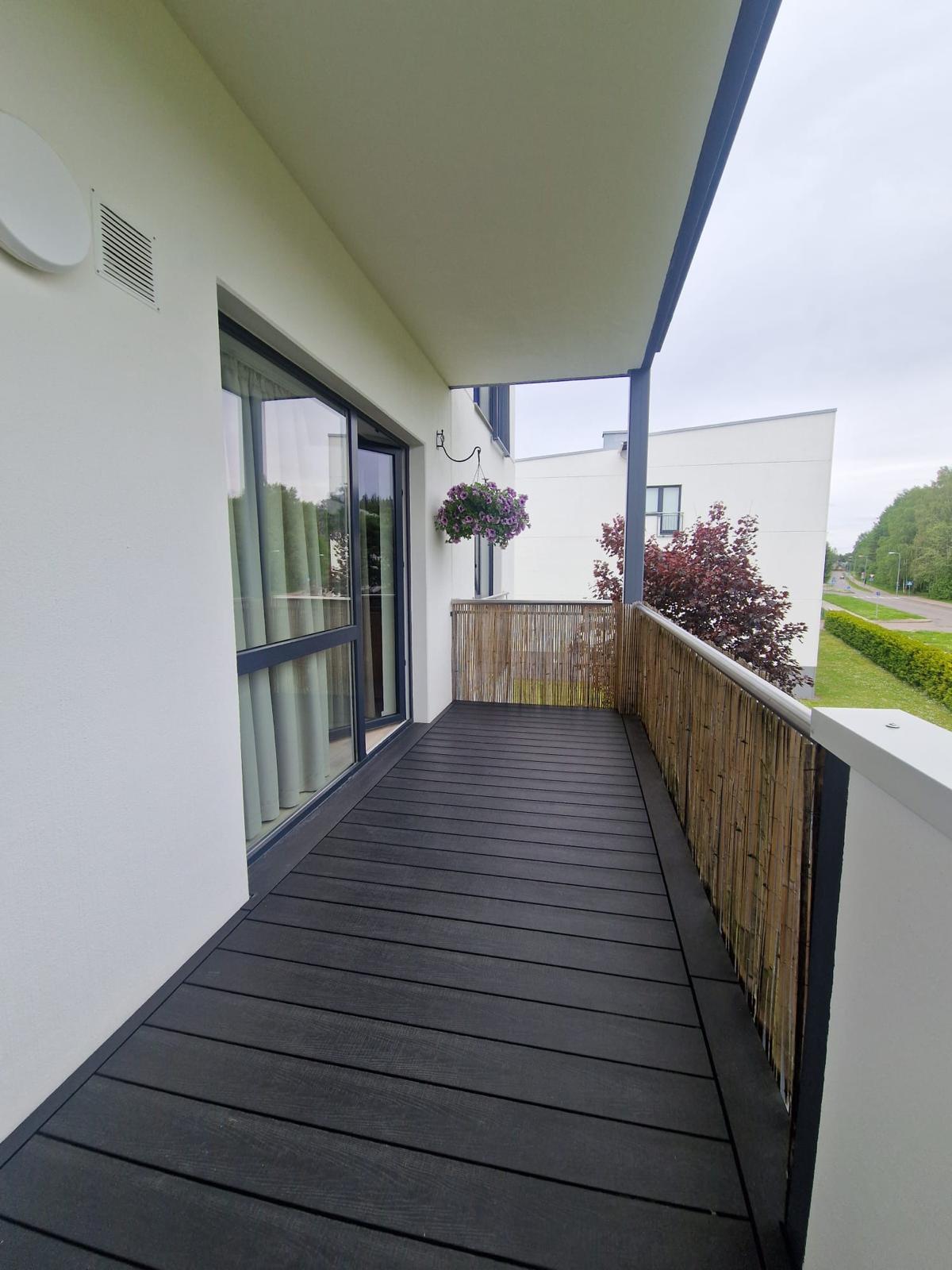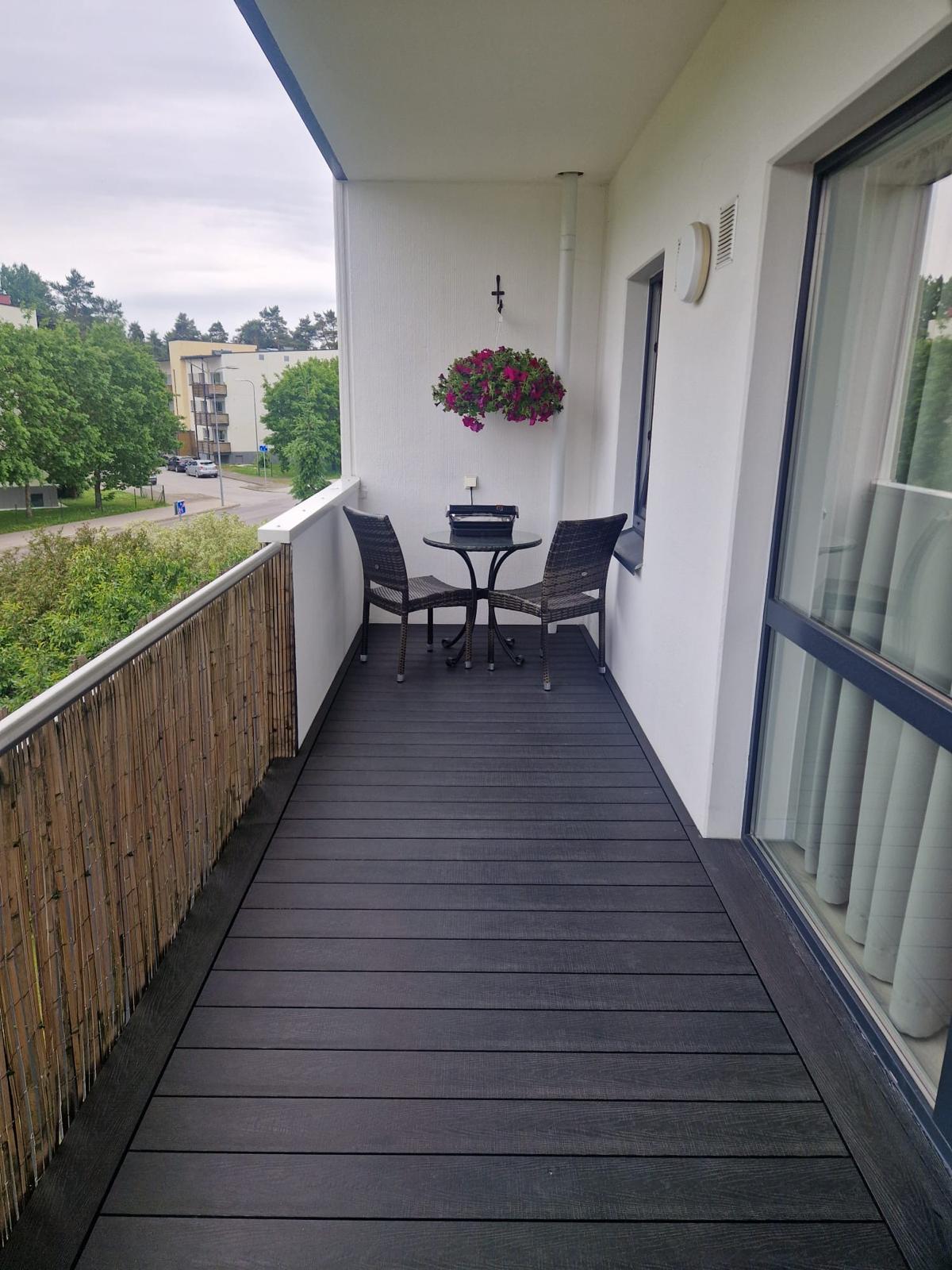 Elutoast pääseb suurte maast laeni akende ja ustega rõdule, mille põrand on kaetud vastupidavate ja niiskuskindlate plastpõrandaliistudega.