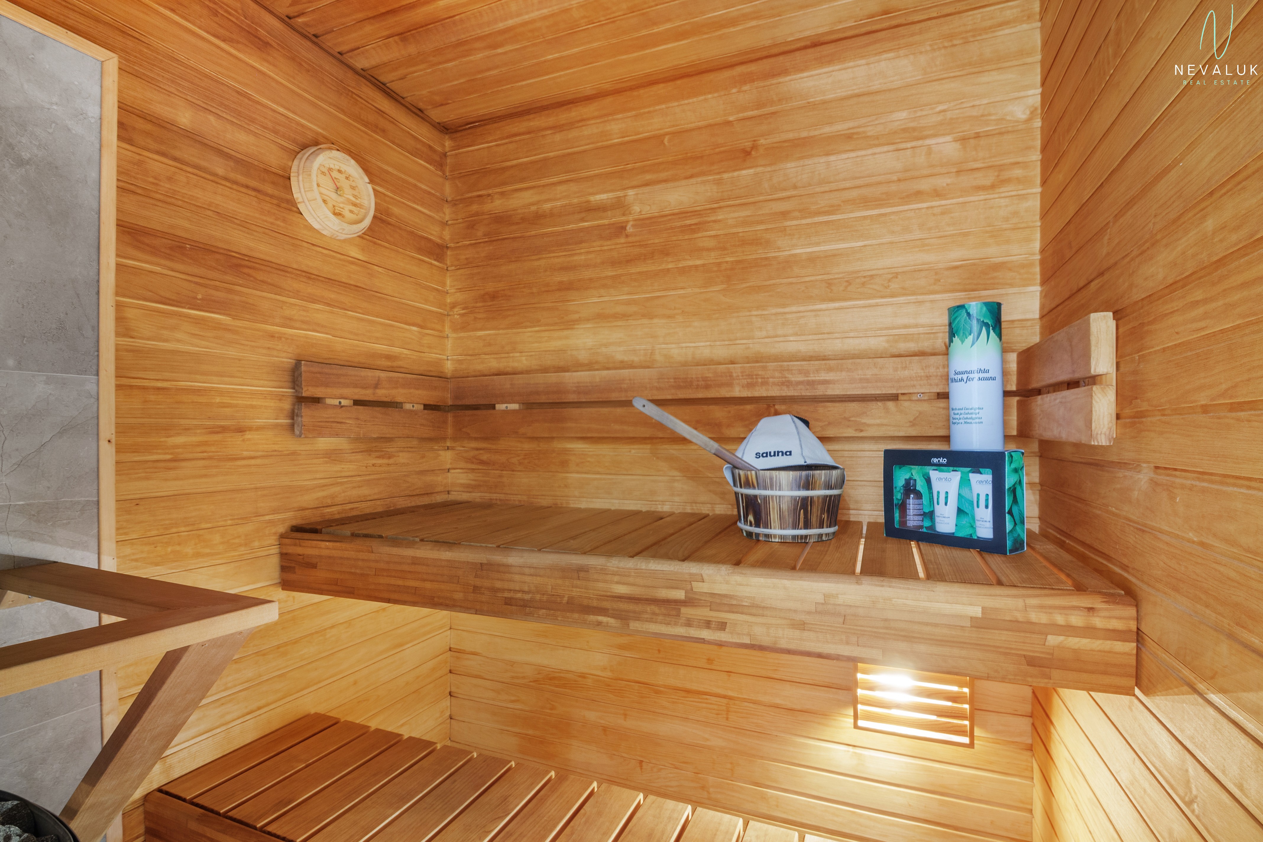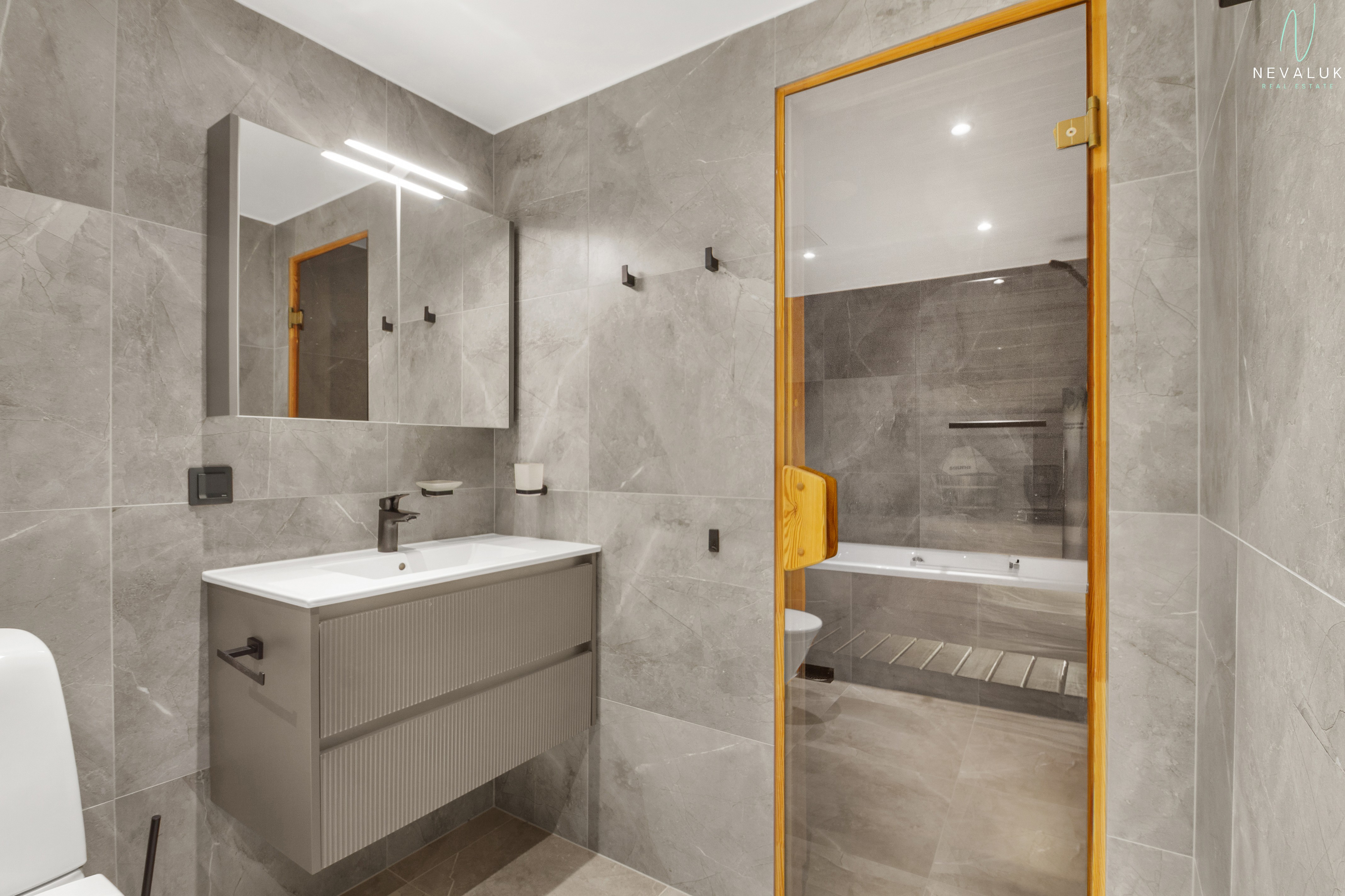Elutoa kõrval asub pesuruum koos saunaga – stiilsete plaatidega viimistletud ruumis on vann, kraanikauss, WC ning elektrikerisega saun, kus saad pärast pikka päeva tõeliselt lõõgastuda.