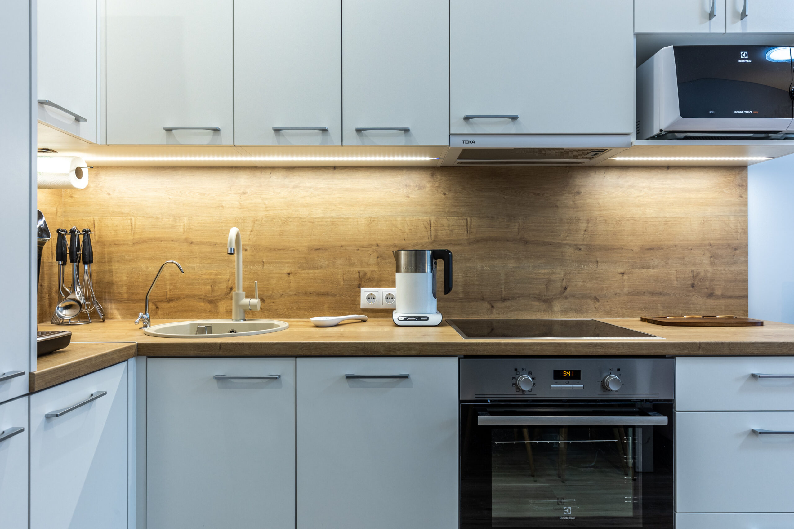 Avatud köögiga eluruum on südameks, kus on uus köögimööbel ja kvaliteetne tehnika: elektripliit ja -ahi, kubu, külmkapp ning nõudepesumasin. Sanitaarruumis on vann, dušinurk, boiler ja pesumasin – kõik läbimõeldult ja stiilselt lahendatud.