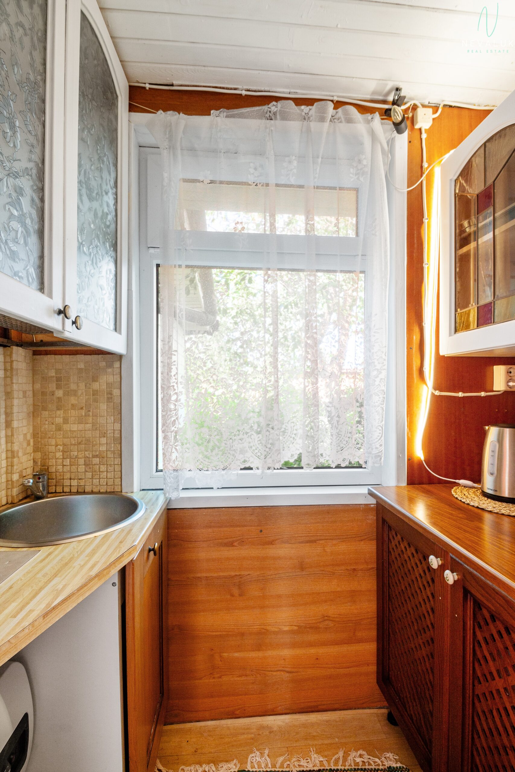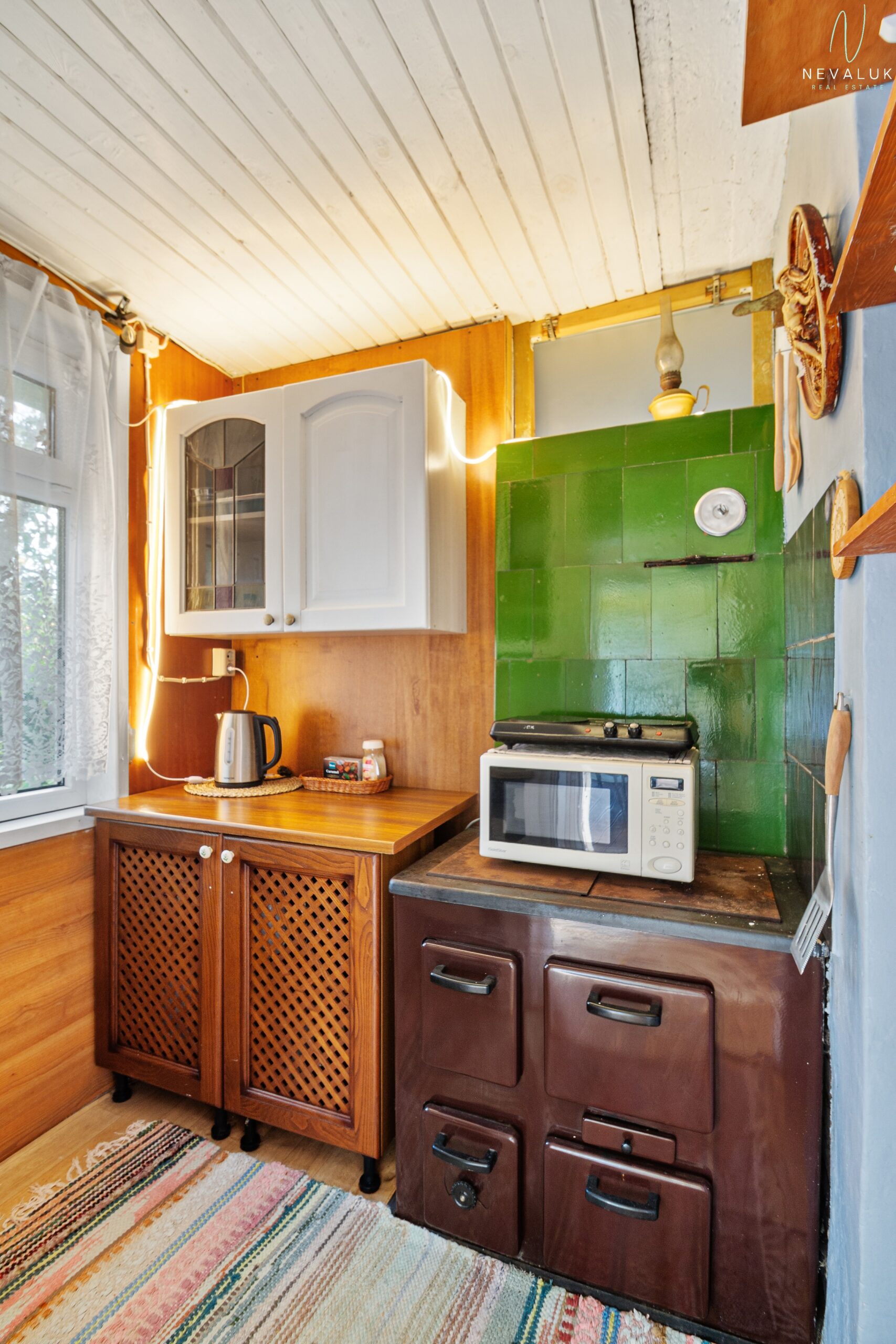 Köök on küll väike, kuid funktsionaalne – olemas kraanikauss, puupliit ja kapid. Lisaks leiab majast garaaži ning kogu piltidel nähtava mööbli. Uuele omanikule jääb kaasa ka uus ja korralik muruniiduk.