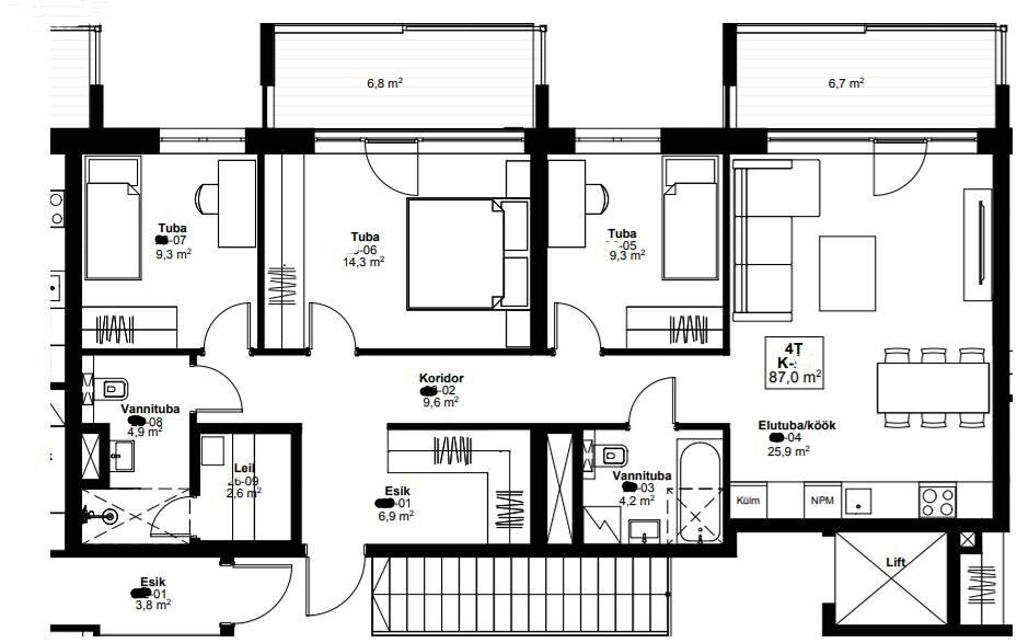 kõik toad paiknevad piki koridori ning ei ole läbikäidavad, tagades rahu ja privaatsuse igale pereliikmele.